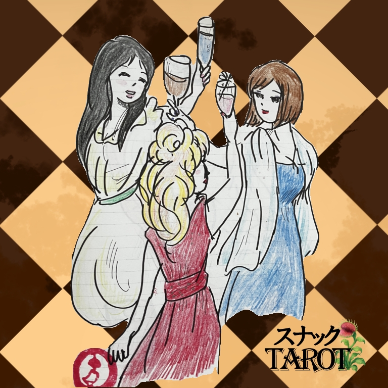 ここはスナックTAROT カップの3 タロットカード Twitter コピー 2026.01.21 ここは華やかな夜の社交場。 星の数ほどの店の中で、一流店にのしあがれるか 場末の店で終わるか キャスト同士の協力で夢を叶えよう!